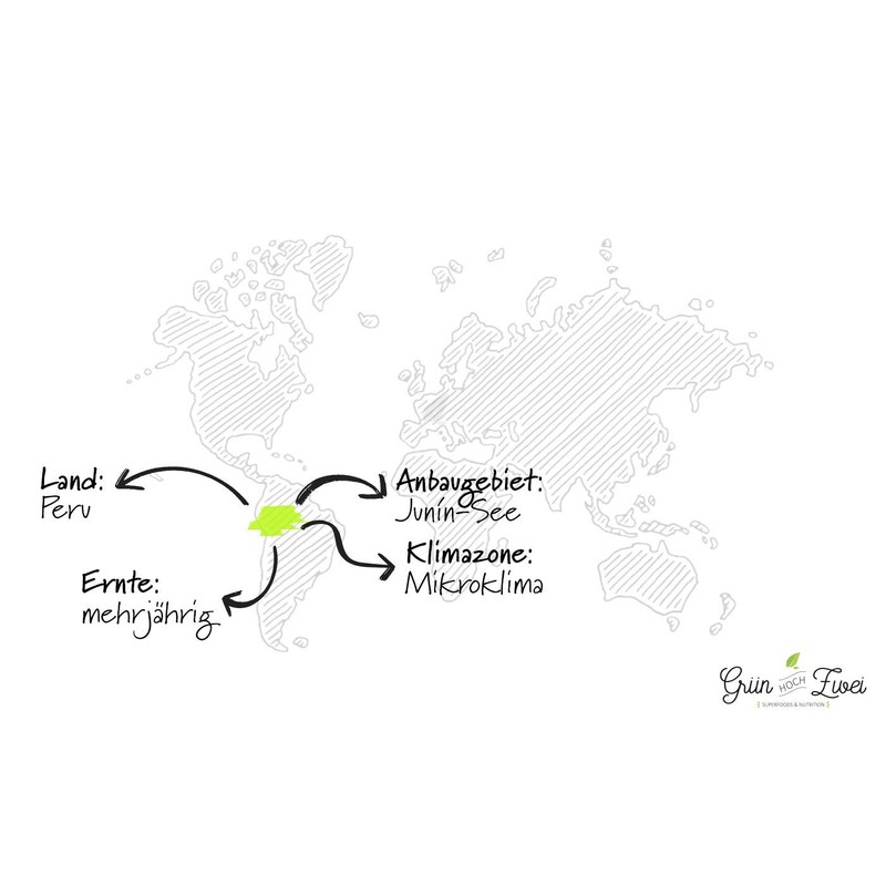 - The maca plant originates in Peru. We only offer 100% single-variety goods from the Maca country of origin. Growing region: Junin-Pasco, at over 4000 m height.