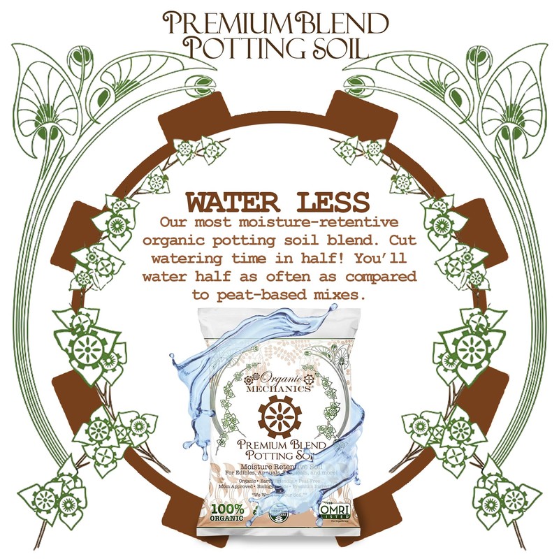 • You will water half as often as compared to using peat-based mixes due to this compost-based mix retaining moisture in the root zone and slowly feeding the plant for long periods of time.