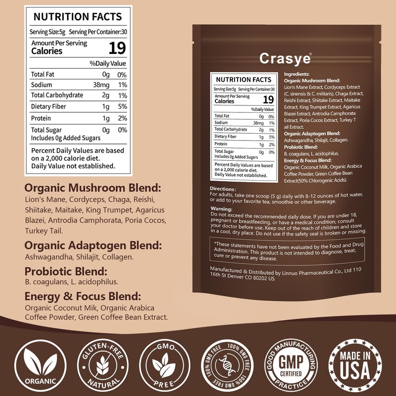 - Premium Organic: We are committed to quality and sustainability. Our mushrooms coffee contain at least 95% organic ingredients and no additives or sweeteners. It is also free of soy and sugar, making it suitable for all dietary needs.