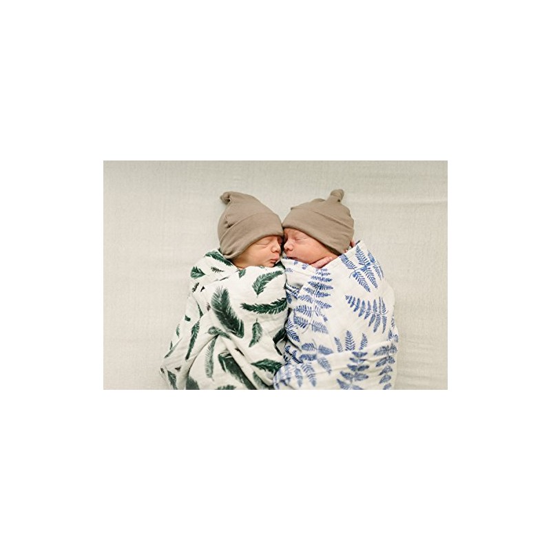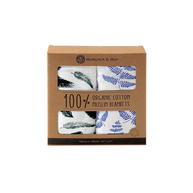 Organic Muslin Swaddle Blankets by Margaux & May - Blue Fern & Green Feather - 47 x 47 inch Ultra Soft Muslin Swaddle Blankets