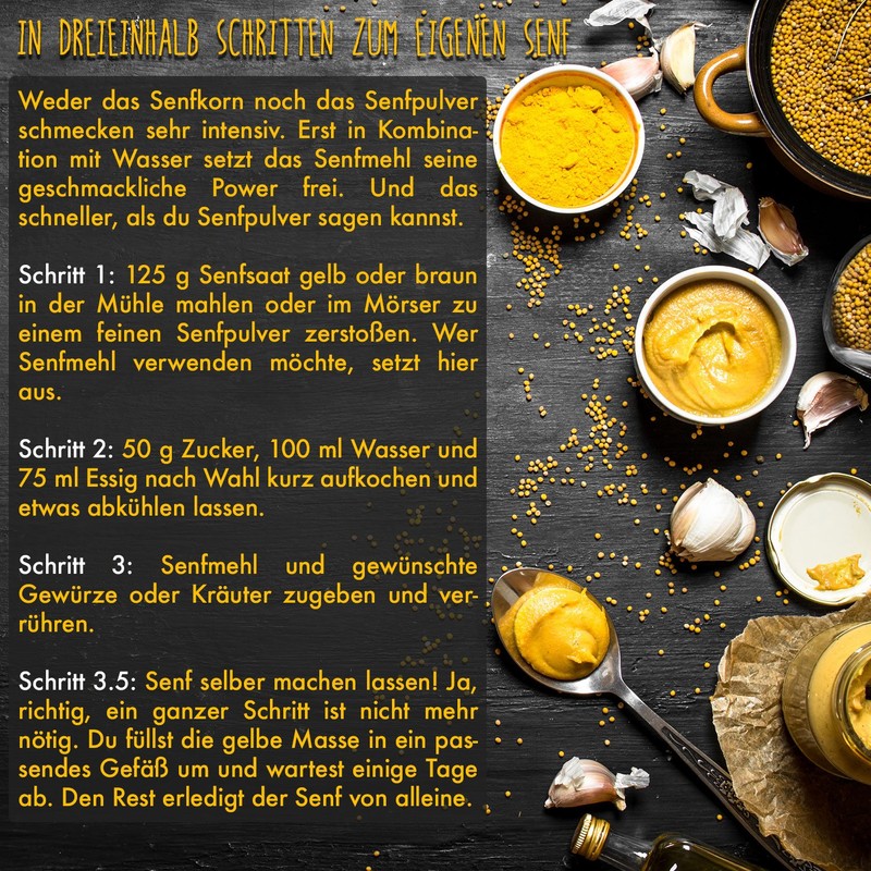- Whether you want to prepare an aromatic mustard as a northern light, or you are a lover of sweet mustard in the south of the Republic. With the mustard flour of the white mustard seed, you can realise your very own recipe ideas in no time.