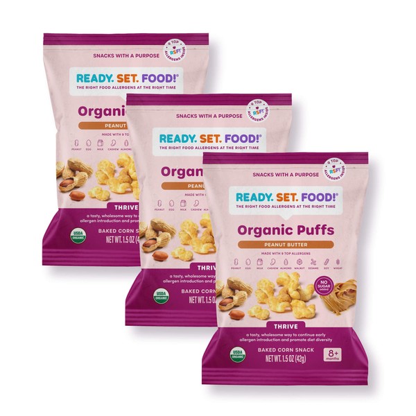 Organic Puffs - Early Allergen Introduction Snack Puffs w/ 9 Top Allergens: Organic Peanuts, Cashew, Egg & More by Ready Set Food, No Added Sugar, Babies 8+ Months, Peanut Butter 3-Pack