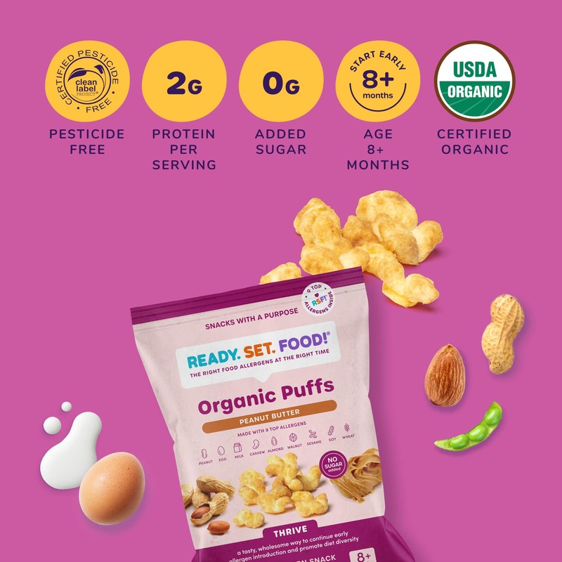Ready. Set. Food! Organic Puffs are a delicious snack purposefully designed to support baby food allergy introduction and maintenance. Our baby food puffs are available in three flavors infants love: Organic Peanut Butter, Organic Daniel Tiger Apple Cinnamon, Organic Daniel Tiger Peanut Butter Berry, and Organic Pumpkin Banana! These dissolvable organic baby food snacks are safe for a baby 8 month old and older and contain 9 of the top most common allergens: organic cashews, peanuts, egg, milk, almonds, walnuts, sesame, soy, and wheat. They’re made without any added sugar or artificial ingredients, won the Clean Label Project Pesticide Free award, and are USDA-certified organic! Our Approach to Baby Allergen Introduction Ready. Set. Food! has developed a research-based, pediatrician-recommended approach to safely, effectively, and gradually introduce infants to some of the highest food allergens. Pediatricians recommend one-at-a-time infant allergy introductions, starting at four months of age, to help support early baby allergy introduction. Our 3 Stage System Mix-in system starts with our Stage 1 Mix-ins, which introduce peanut, egg, and milk and are added to bottles and organic baby foods. These baby food allergy mix-ins come as individual packets that are given over the course of 15 or 30 days. The beginning packets introduce milk, the next packets introduce egg while maintaining exposure to milk, followed by the introduction of peanut while maintaining exposure to milk and egg. Stage 2 Mix-ins are designed to maintain continued exposure to those top 3 allergens, and must be consistently given for at least 2 months. Stage 3 Mix-ins introduce 6 additional top allergens, and can be given to children at 6+ months. As your little one continues to grow and eat, we also offer Ready. Set. Food! Baby Oatmeal and Organic Puree, for a 6 month old baby and older who has started eating solids, Organic Baby Food Puffs for an 8 month old or older, and Organic Fruit and Oat Bars for a 12 month old and older.