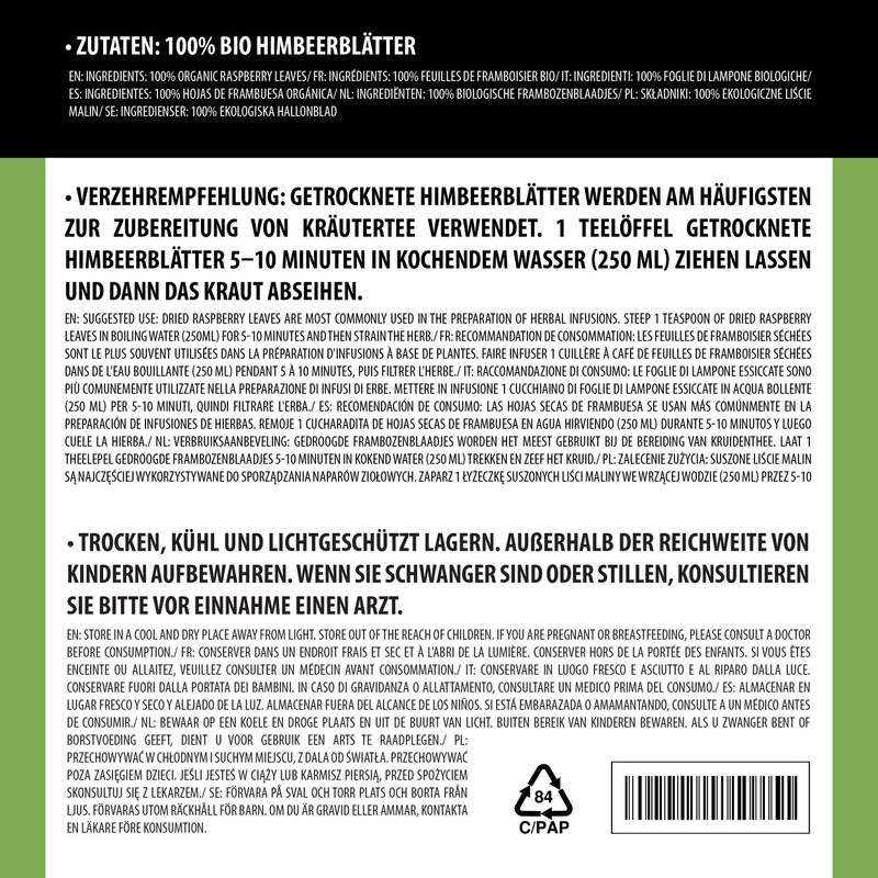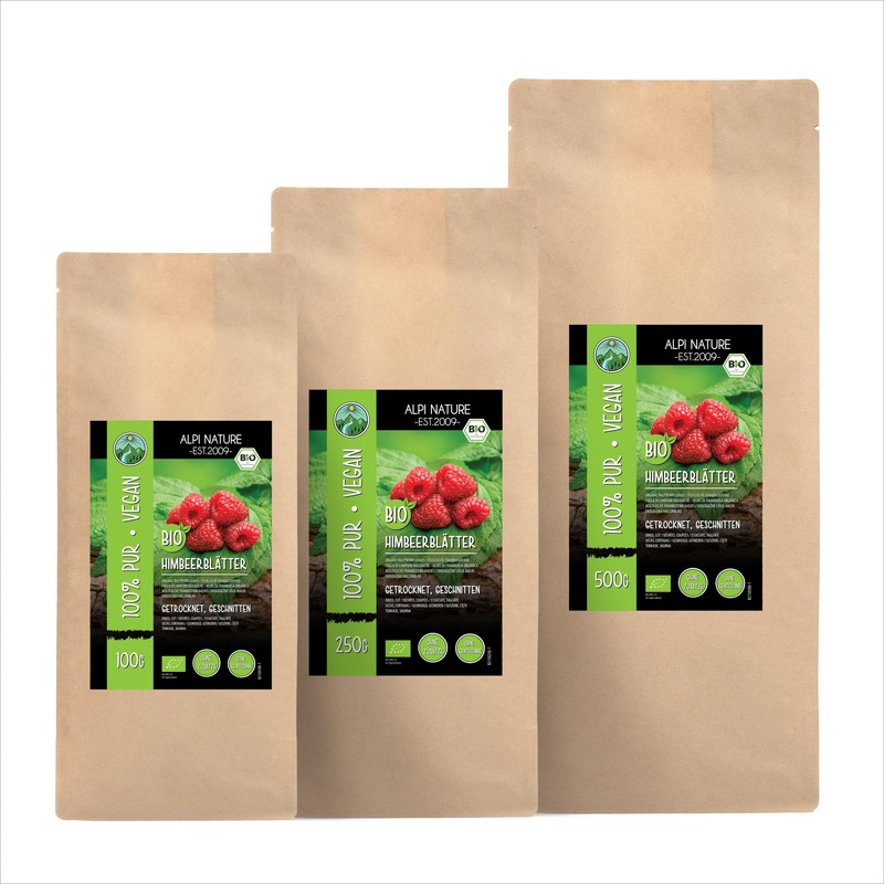 - Organic quality: our raspberry leaves come from wild collection and are certified organic. They are vegan, free from any preservatives, colours and flavours - a 100% natural product.