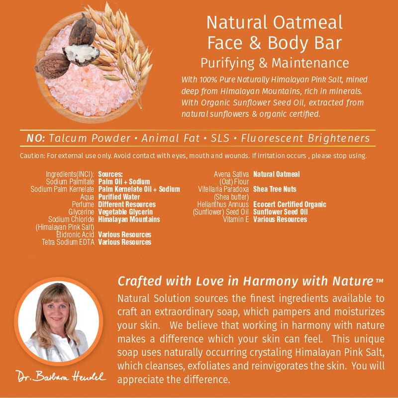 Natural solution offers the organic face and body bar that is imposed of organic oatmeal and Himalayan pink salt. We use pink salt in our skin and beauty care products due to its skin curing properties. It is extracted from the most pure source of salt that is in Punjab region of Pakistan. Moreover, it is loaded with 84 essential minerals therefore, it is best for skin conditioning and nourishment.