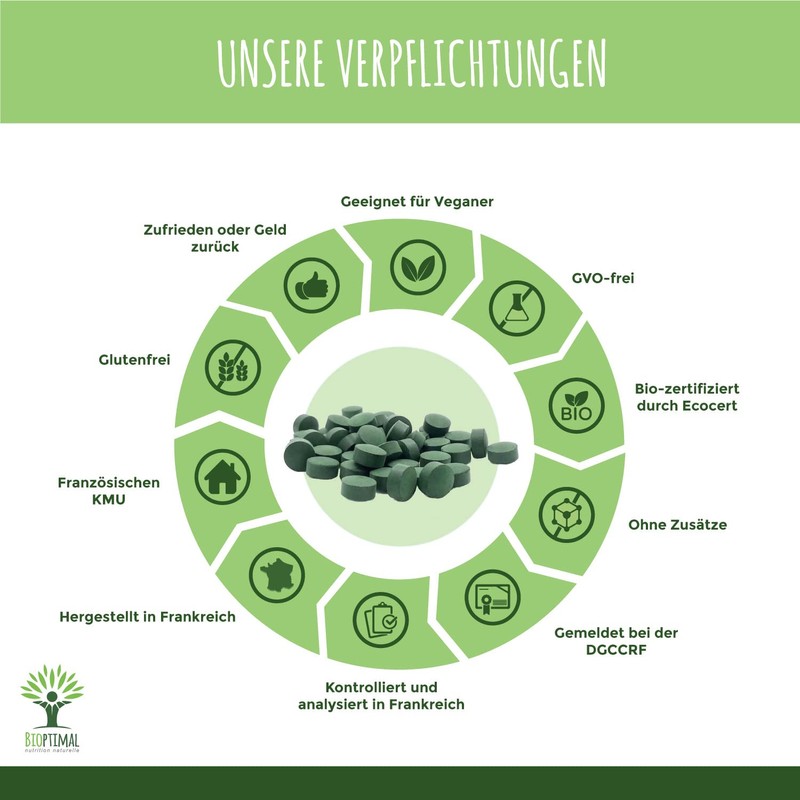 - French certification: our products are tested, analyzed and packaged by us in our workshop in France. Our tablets are cold pressed from dried, pure and organic spirulina powder. Perfect for vegetarians.
