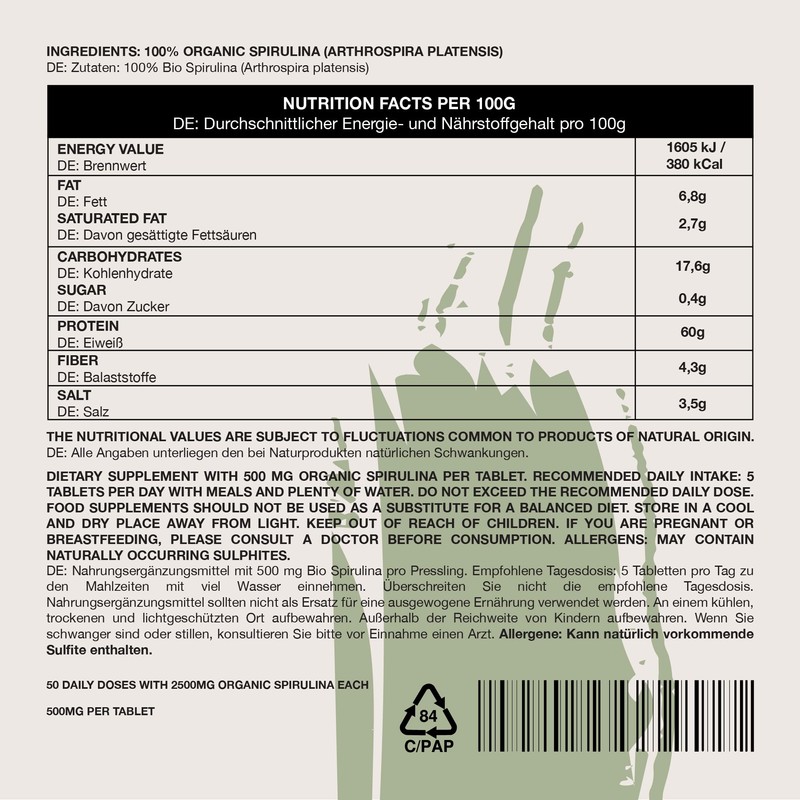 - Versatile use: Spirulina tablets can be taken pure with meals and with plenty of water or added to smoothies, juices, shakes and culinary recipes by chopping or mixing. The recommended daily dose is up to 5 tablets per day.