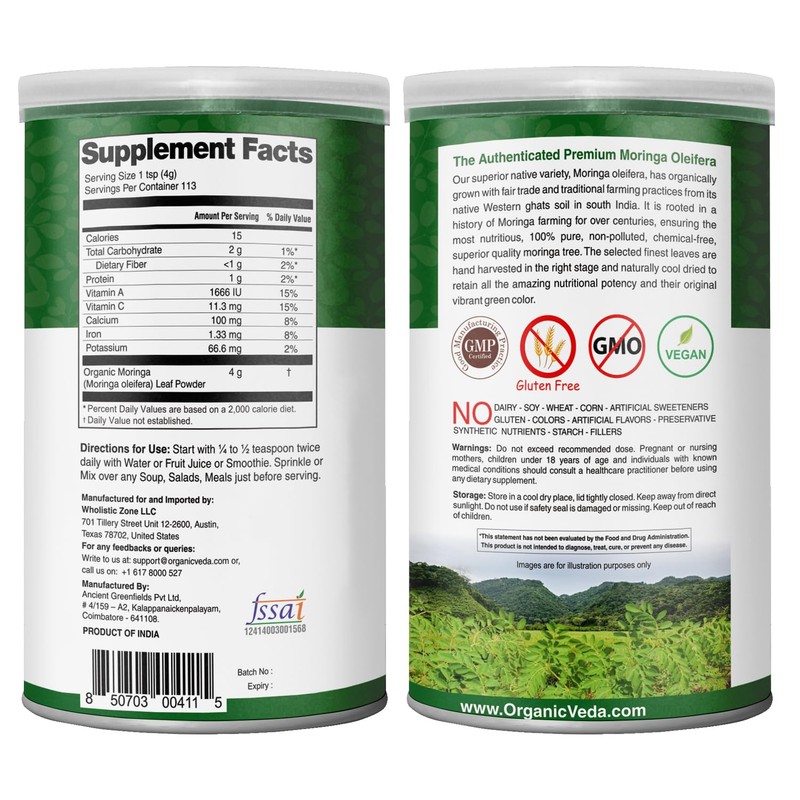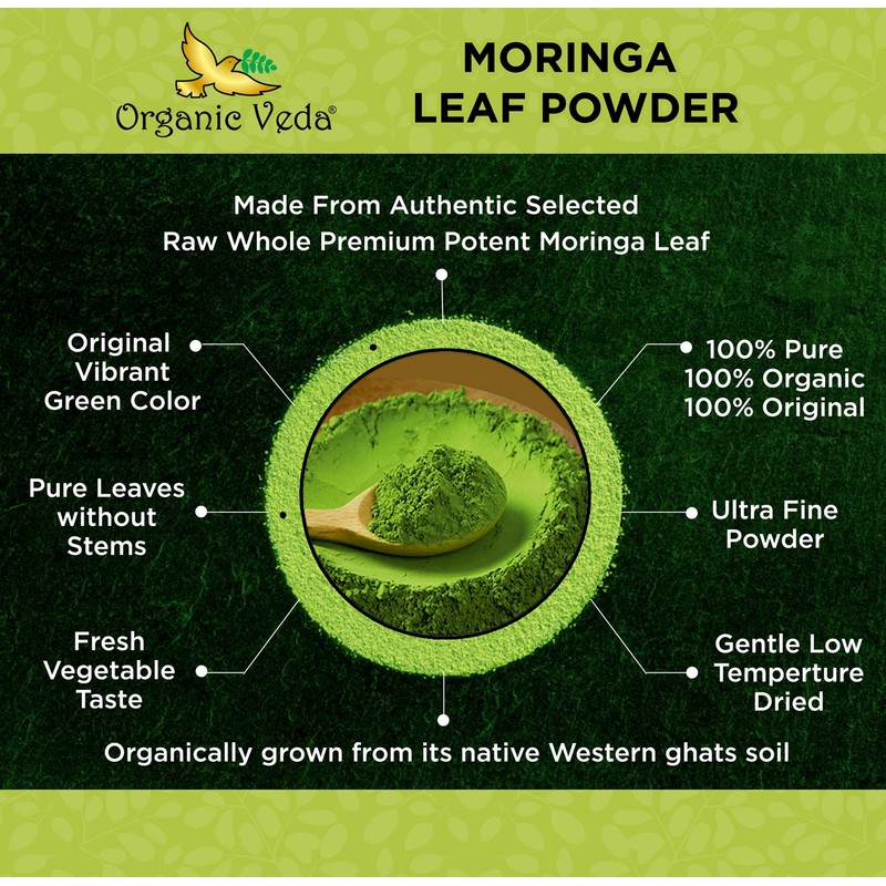 Organic Veda Moringa Powder (1 lb) The Real Green Native Moringa Oleifera, Premium Harvest Peak Nutrients, Vitamins & Antioxidant Rich Leaves - USDA Organic, Gentle Dried Drumstick Leaf Powder