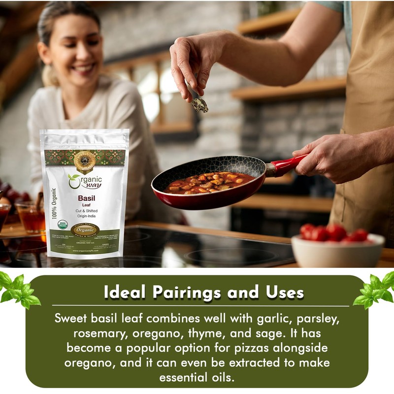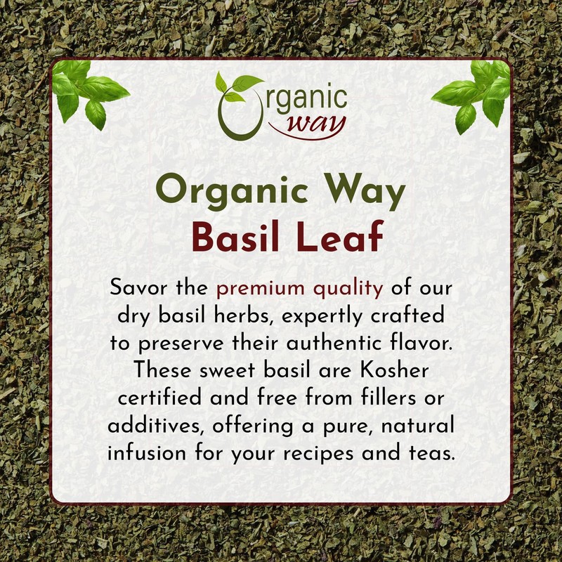 Organic Way Organic Way Basil Leaf Cut and Sifted | Non GMO, Kosher, USDA Certified Organic Basil Leaves | Dried and Ground C Peppery and Aromatic Seasoning for Soups | 100% Raw from India (4 OZ)