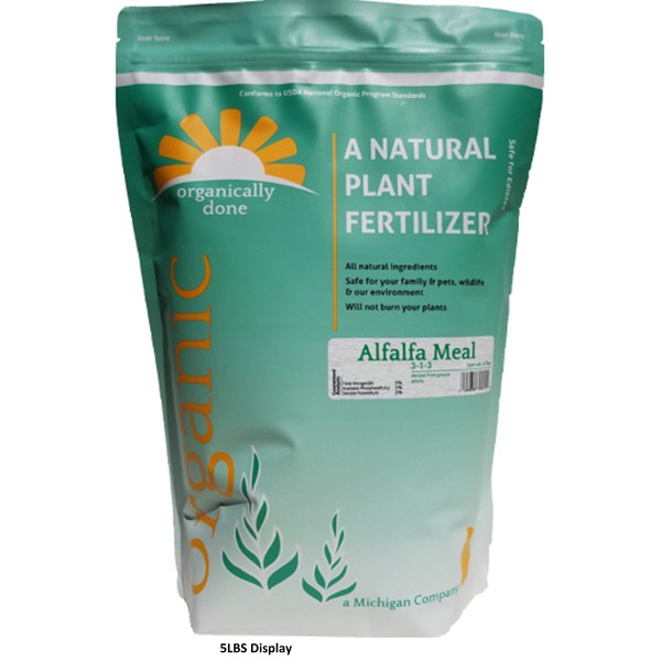 Unlike other manufacturers, Organically Done uses only 100% organically grown alfalfa (3-1-3) (meaning no pesticide residue or GMO), conforming to USDA National Organic Program (NOP) standards for organic agriculture usage. Its use is safe for the environment and living organisms. Contains macro plant nutrients, trace minerals and triaconatol, a natural growth stimulant. Derived from: ground organic alfalfa Shelf Life: nutrient benefits never expire Storage: store in cool, dry location out of direct sunlight Organic forms of nutrients are often more readily available to plants than chemical forms - a direct comparison of nutrient values is not appropriate. Alfalfa Meal is naturally a slow-release product that will not leach into the environment.