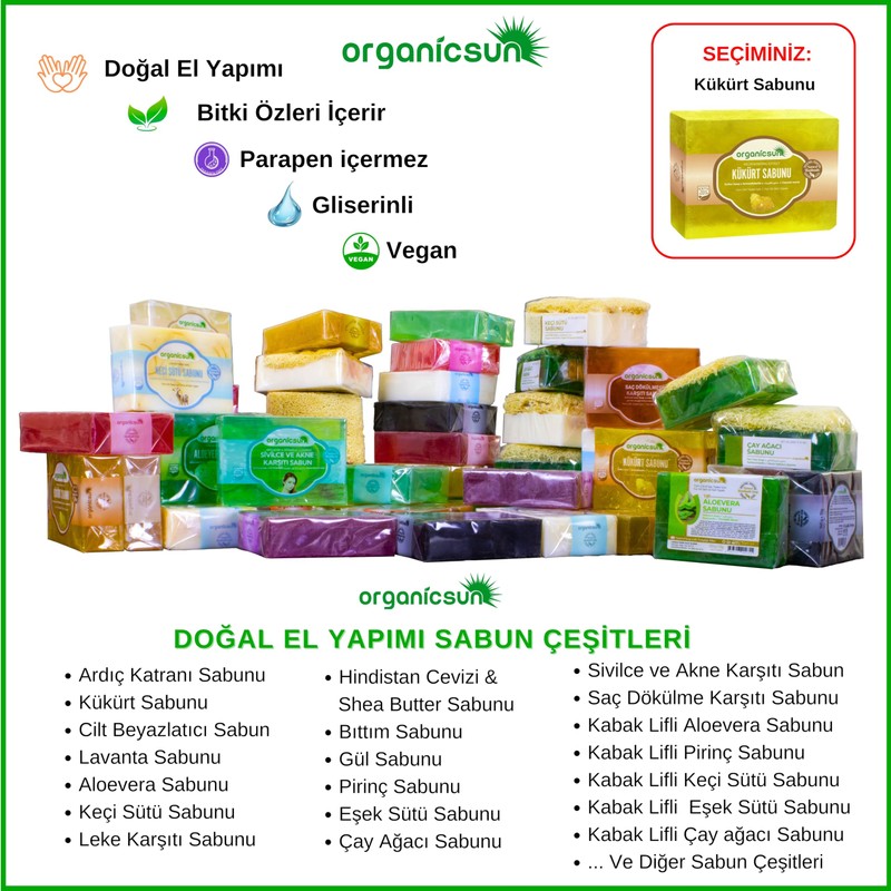 - Organicsun Kükürt Sabunu ile Doğal Güzelliğinizi Ortaya Çıkarın! 🌿 Cildinizin ihtiyaç duyduğu doğal bakımı Organicsun Kükürt Sabunu ile keşfedin. El yapımı ve doğal bitkisel yağlar ile zenginleştirilmiş bu özel sabun, cildinizi nazikçe temizlerken arındırır ve yeniler. Her kullanımdan sonra cildinizde ferah ve temiz bir his bırakır. 🌟