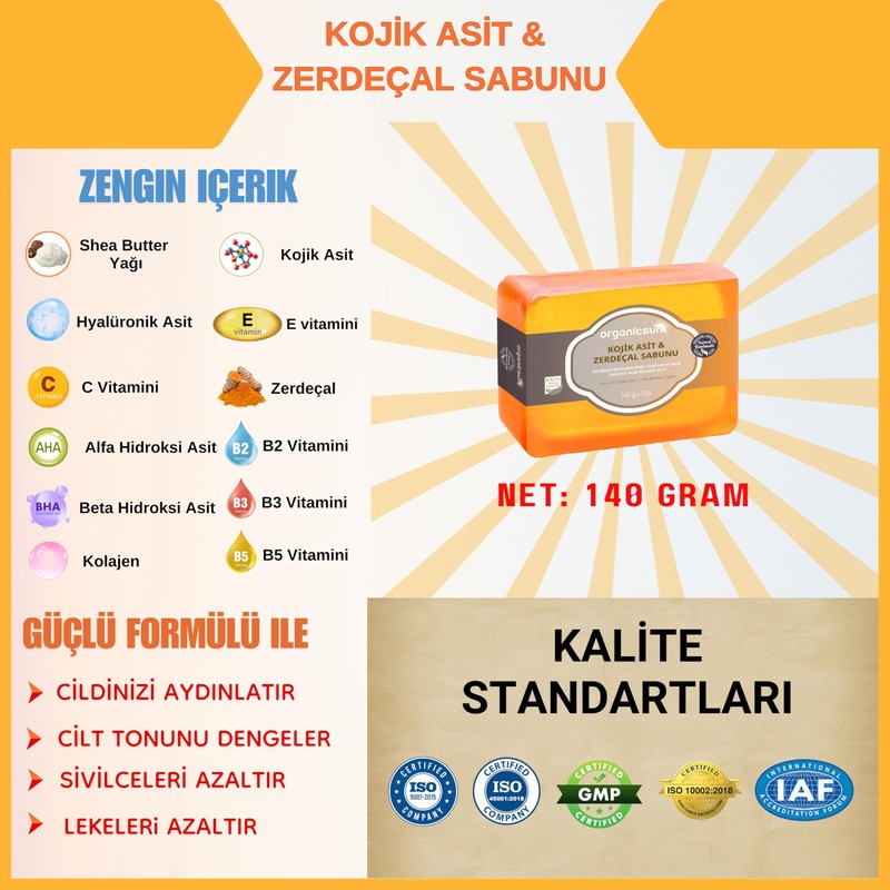 - Cildinizin doğal ışıltısını ortaya çıkaran Organicsun Kojik Asit & Zerdeçal Sabunu, özel formülüyle leke ve sivilce karşıtı bakım sunar. İçeriğindeki Kojik Asit cilt tonunu eşitlemeye yardımcı olurken, Zerdeçal güçlü antioksidan etkisiyle cildi yatıştırır ve besler.