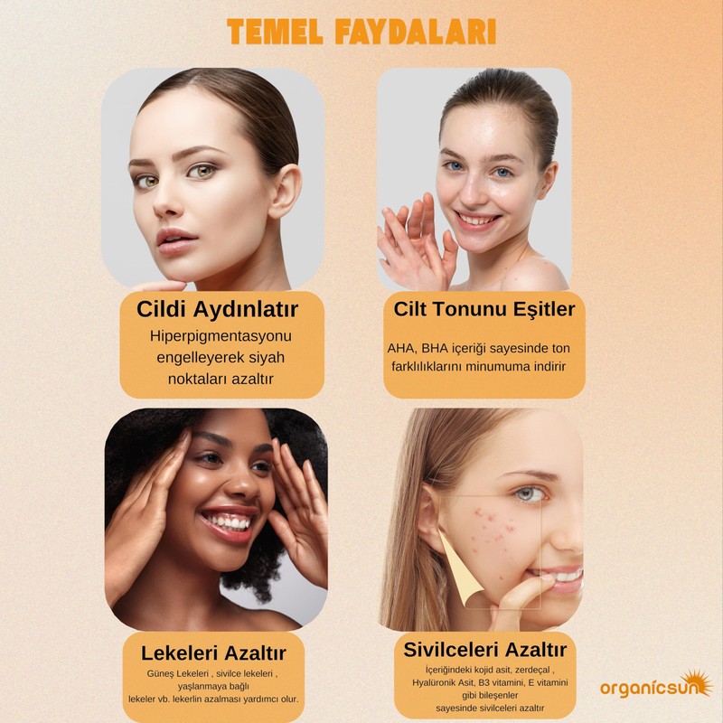 - Öne Çıkan Bileşenler: ✔ Kojik Asit – Cilt lekelerine karşı etkili ✔ Zerdeçal – Cildi besler ve yatıştırır ✔ Kolajen – Cildin esnekliğini destekler ✔ AHA & BHA – Ölü deriyi arındırarak pürüzsüz bir görünüm sağlar