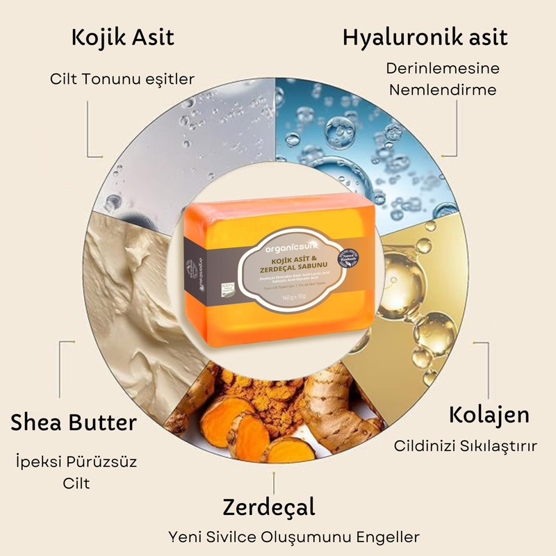 Organicsun Kojik Asit & Zerdeçal Sabunu 140 Gr Leke ve Sivilce Karşıtı Kojic Acid - Kolajen - AHA BHA - C Vitamini - Hyaluronic Acid - Shea Butter Yağı İçerikli Aydınlatıcı Sabun