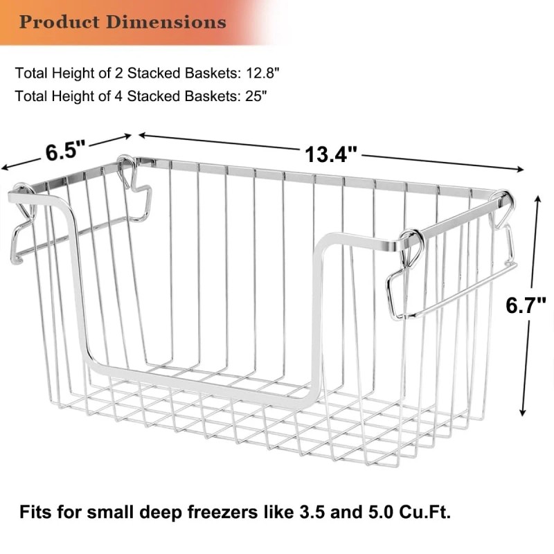 The wire freezer organizer bins storage baskets cater to most chest freezers, and small freezer basket is better to categorized storage, the unique wire design not only locking freshness faster but see your meats, vegetables, and desserts conveniently and take it out quickly.
