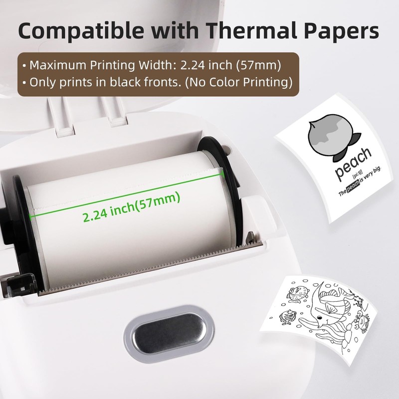 - Versatile Printing: The note printer supports various sticker paper types, including clear, semi-transparent, gold glitter, and silver; And suitable for multiple sizes of sticker papers, with a maximum print width of 2.24 inches (57 mm), meeting diverse printing needs