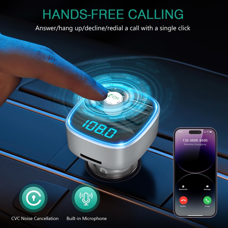 - Excellent HI-FI Crystal Clear Sound: Built-in microphone with CVC noise reduction technology creates full duplex sound quality for hands-free talking and navigation voice broadcast. The full FM radio frequency range from 87.5 to 108.0 MHz is wider than ordinary transmitters