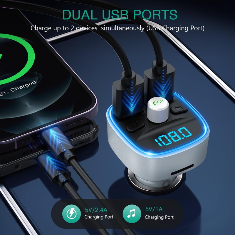 - Unique LED Design: This FM transmitter is designed with blue LED lights, allowing you to see the buttons clearly in the dark. It automatically switches on and displays your car's battery level, making it easier to operate and drive safely at night