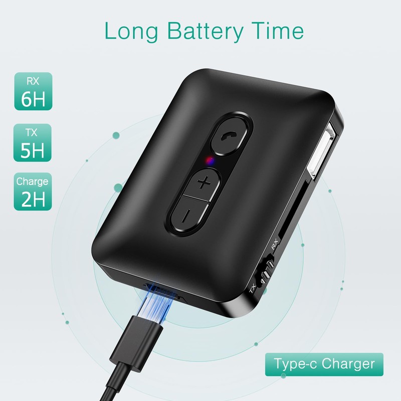 - Long Battery Life & Compact Size: The Bluetooth Aux Adapter comes with a Type-C charging cable that can be fully charged in 2 hours. It can be used continuously for 6H in transmit mode and 8H in receive mode after a full charge. The compact size of the Bluetooth Aux adapter (12*44*60 mm) allows you to take it with you wherever you go
