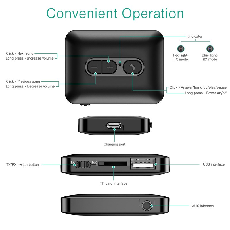 - 2-in-1 Bluetooth Adapter: 2-in-1 Bluetooth Aux Adapter supports both transmit and receiver modes. In TX mode, Bluetooth Transmitter can connect non-Bluetooth audio sources such as TV, PC, MP3 player to Bluetooth-enabled speakers, or headphones. In RX mode, Bluetooth receiver can connect smartphone or other Bluetooth source device to non-Bluetooth wired speakers, car/home stereos, headphones