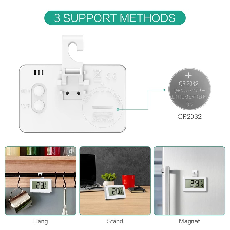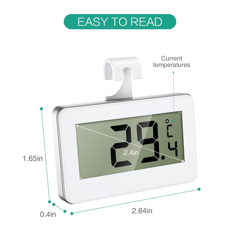 - 【Wide Measuring Range & Easy Operation】The measuring range of the refrigerator thermometer: -20℃-60℃ (-4-140℉), accuracy: ±1℃/±1.8℉. The suitable temperature of the refrigerator compartment: 3℃-10℃; the suitable temperature of the freezer compartment: -4℃-20℃. The refrigerator fridge thermometer has only two buttons: ON/OFF and ℃/℉. In addition, the thermometer is powered by a CR2032 battery, and the battery can be easily replaced by opening the battery cover on the back.
