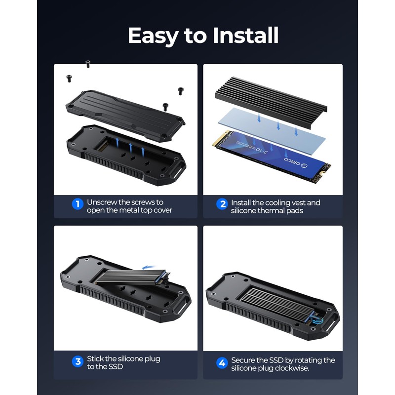 - 【WHAT'S IN THE BOX】 SSD enclosure, user guide, usb-c to usb-a/c cable, silicone thermal pad, cooling vest, braided lanyard, screw driver and screws for installing SSD. Users need to buy and install SSD by themselves.