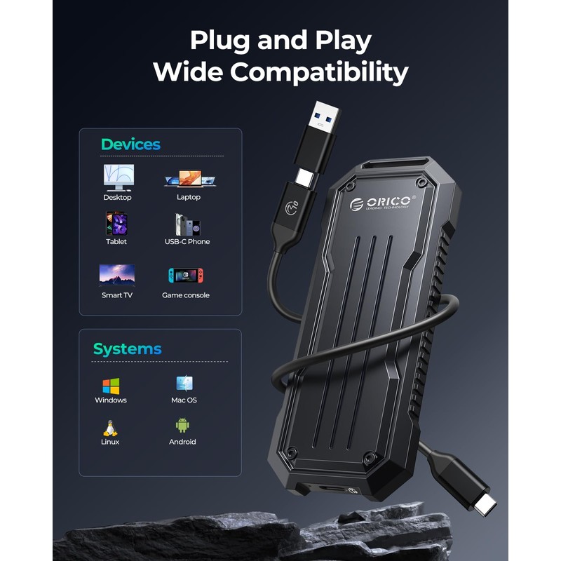 - 【10Gbps High Speed】ORICO M.2 NVMe SATA SSD enclosure adopts the latest USB 3.2 Gen 2 Type-C interface, support UASP acceleration protocol, when using NVMe SSD, support theoretical data transmission speed up to 10Gbps, when using M.2 SATA SSD, support theoretical data transmission speed up to 6Gbps. One HD movie transfer only takes 2-5 seconds. Allows you to quickly store and edit your photo and video files.