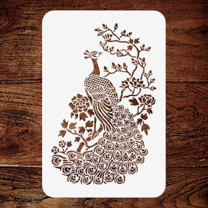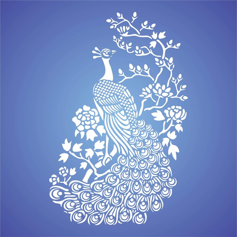 Oriental Peacock Stencil, 6.5 x 10 inch (S) - Chinese Japanese Asian Peacock Bird and Flowering Tree