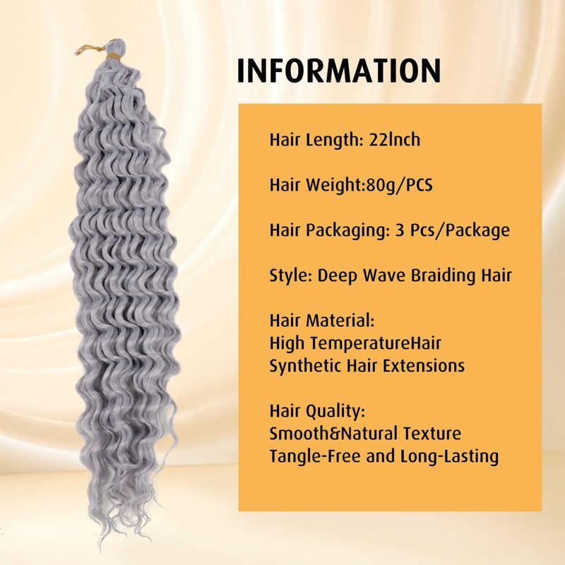 - 22inch 30inch deep wave crochet hair is crafted from high quality synthetic fiber,the ocean wave braiding hair is very soft,light,full and looks natural,no chemical smell and will not cause allergies and skin itching. ocean wave crochet hair very close to human hair.