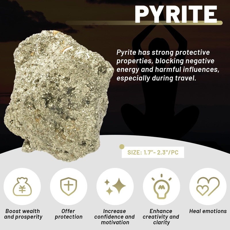 - WEIGHT&SIZE---- The Pyrite Cluster is about 1.7″- 2.3″/PC, and the Clear Quartz Crystal is about 1.8″- 2.7″ /PC. Each stone is irregular, unpolished and rough.