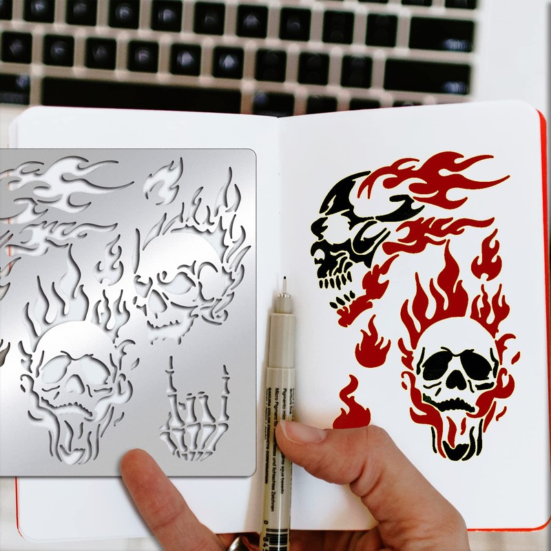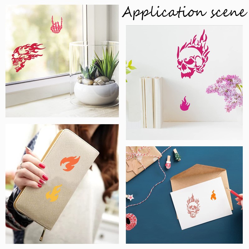 - Skull Theme Stencil: Including Fire skulls of various shapes element. Provide Inspiration for your themed greeting cards craft project.