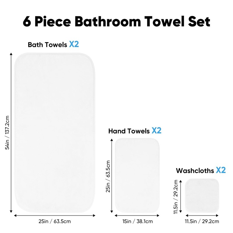 - MULTIPURPOSE USAGES: Each set includes 2 bath towels of 27 x 54 inches, 2 hand towels of 15 x 25 inches, 2 wash cloths of 12 x 12 inches. Our towel set can be your ideal choice of multipurpose companions beyond bath time, such as travel, gym, sport, camp, beach, pool and so on