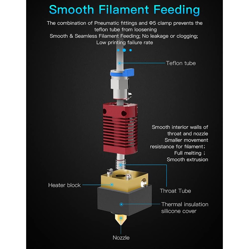 - Smooth Filament feeding: The combination of pneumatic fittings and Φ5 clamps prevernts the teflon tube from loosening, smooth and seamless filament feeding; no leakage or clogging; Low printing failure rate.
