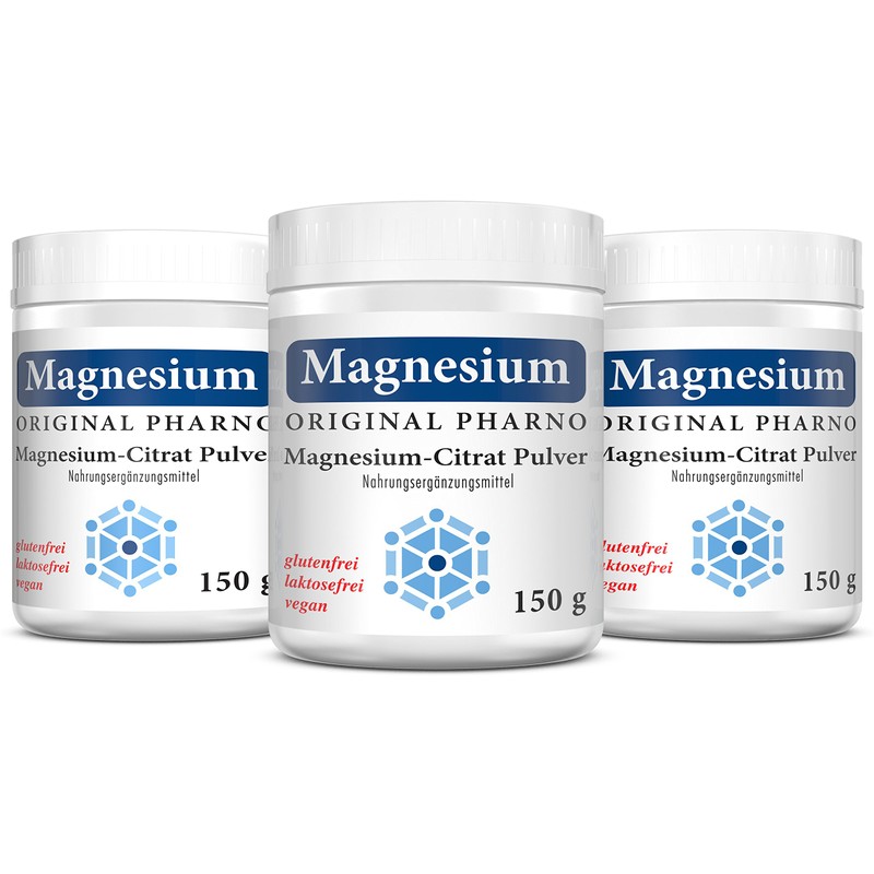 Original Pharno Magnesium-Citrat Pulver - 100% Pures Magnesiumcitrat ohne Zus?tze - Fr Muskeln, Nerven & Elektrolytbalance - 3 x 150 g | 3 Dosen [Original-Pharno]