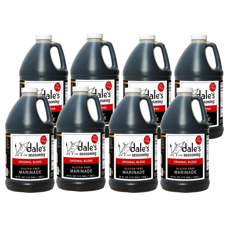 Introducing Dale's Gluten-Free Steak, Poultry and Vegetable Marinade and Seasoning in a convenient 64-ounce family-size bottle (equivalent to 1/2 gallon) Crafted by the renowned brand Dales, this liquid seasoning brings a harmonious blend of flavors to your culinary creations. Delight in the captivating mix of soy sauce, onion, garlic, sugar, monosodium glutamate, ginger, and paprika.