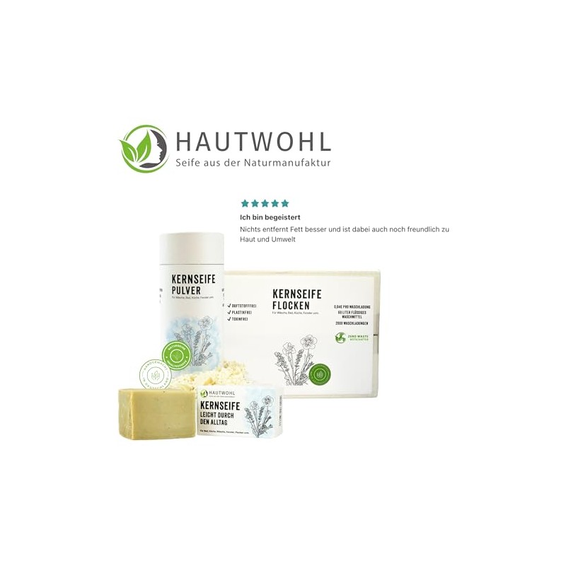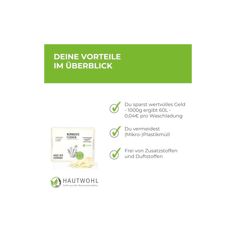 - 100% Natürlich & Sanft zur Umwelt Unsere Kernseife Flocken sind frei von Duftstoffen, Palmöl und unnötigen Chemikalien – perfekt für dich und die Umwelt. Sie sind sanft zur Haut, aber stark gegen Schmutz!