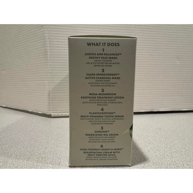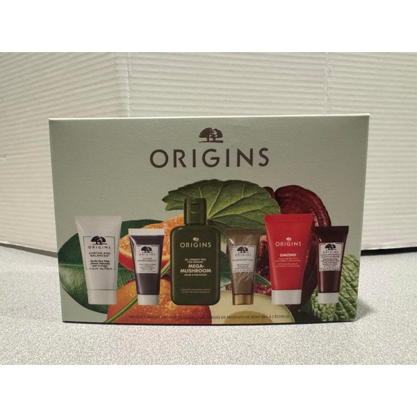 - Set include: Origins Check and Balance Frothy Face Wash 1oz/30ml; Origins Clear Improvements Active Charcoal Mask to Clear Pores 0.5oz/15ml; Mega-Mushroom Relief & Resilence Shooting Treatment Lotion 1.7oz / 50ml; Plantscription Multi-powered Youth Serum 0.5oz / 15ml; Ginzing Energizing Gel Cream 1oz / 30ml; High-Potency Night-A-Mins Resurfacing Cream