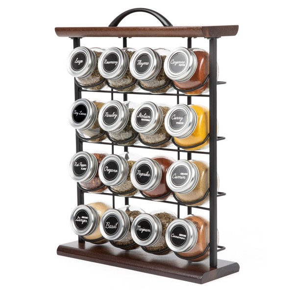 - 16 JAR SPICE RACK: This kitchen spice organizer comes with 16 glass spice jars with a capacity of 3 ounces each, providing ample space for your favorite spices, herbs, and seasonings. The clear jars allow you to easily identify the contents, making it convenient to use and refill. They include sift and pour lids for easy dispensing.