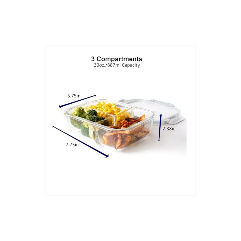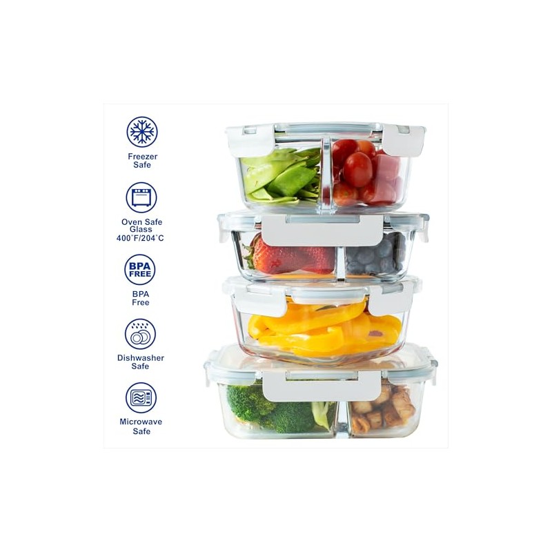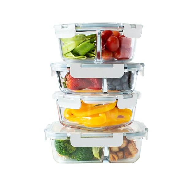 • 4 GLASS MEAL PREP CONTAINERS: Each of these containers has unique dividers and compartments for optimal food storage. Prepare your lunch or preserve leftovers.