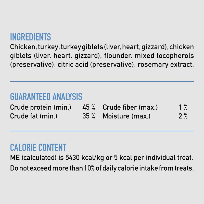 Treat your dog with delicious and nutritious ORIJEN Freeze Dried Original Dog Treats. These ORIJEN dog treats are freeze dried to lock in the rich nutrients and taste, making them packable and perfect for adventures. At just 5 calories each, these treats are loaded with protein and amazing flavor. Containing 99 percent animal ingredients*, ORIJEN dog treats provide a high protein option for training or rewarding your dog. These high protein dog treats are made with high-quality animal ingredients, including free run** poultry and wild-caught flounder, giving your dog an amazing taste. ORIJEN WholePrey ingredients including nourishing organs provide your dog with the most succulent and nutrient-rich parts of prey. *Approximate and derived from the unprocessed state of the ingredients. **Our free-run chickens and turkeys are not housed in cages and are able to move in a barn without outdoor access.
