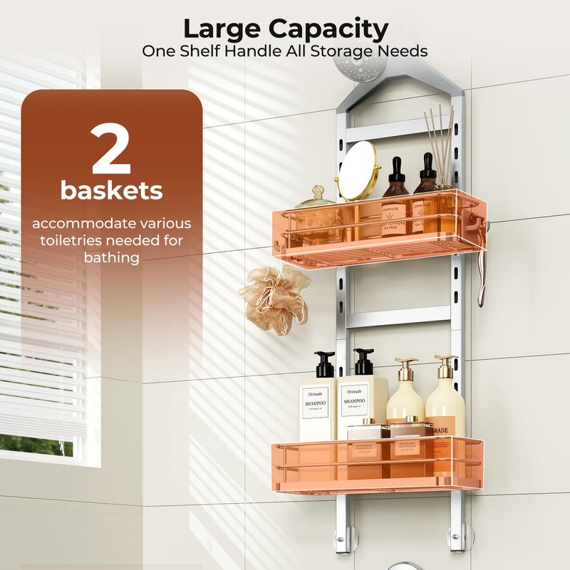 Orimade Aluminum Hanging Shower Caddy Over Head, Adjustable Bathroom Shelf with Hooks, Anti-Slip Rustproof Organizer Storage Rack Basket, Silver, 2 Tier