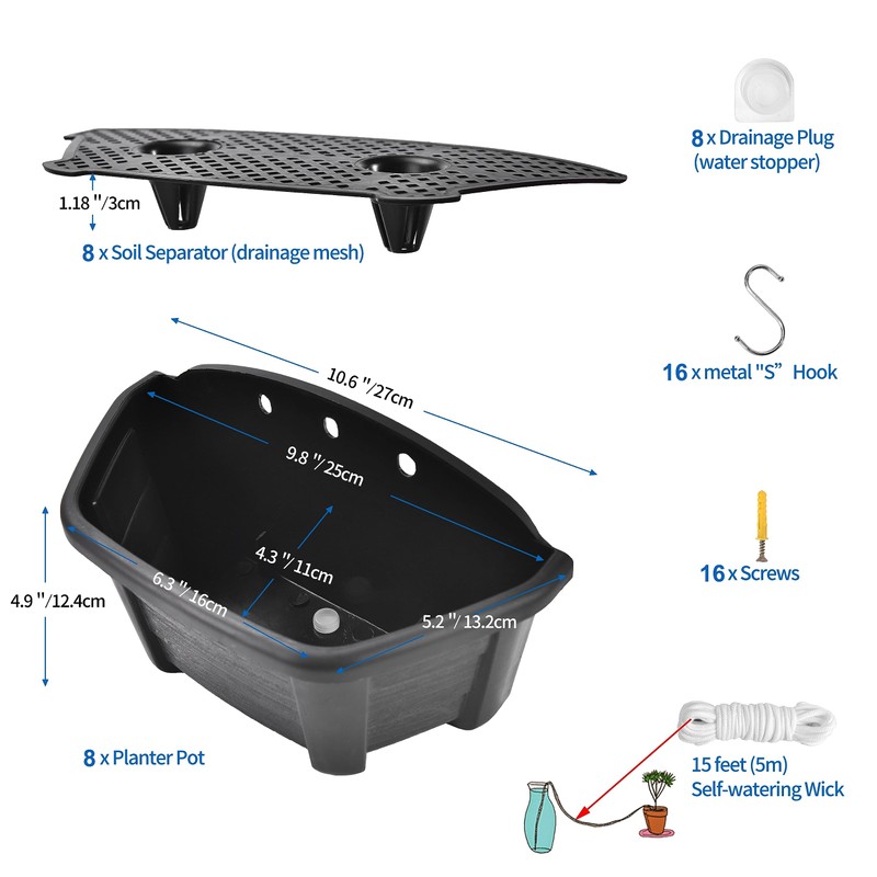 • Size & Material & Valuable Package: Size (L*W*H): 9.8"x4.3"x4.9". Flat-backed wall planter made of high-quality durable PP material. Package includes: 8 x planter pot + 8 x drainage tray + 8 x drainage hole plug + 15 feet self-watering wick cord+ 16 x S-hooks + 16 x screws with anchors. Great Value gift for family and friends. Perfect for wedding, Christmas, birthday and so on.