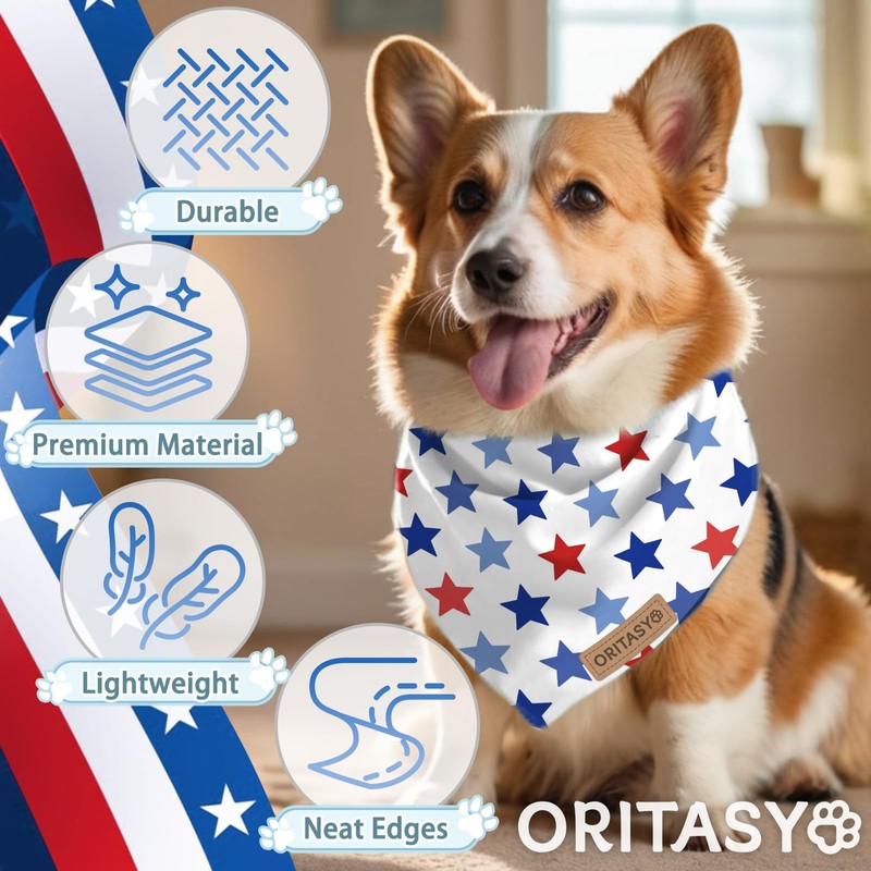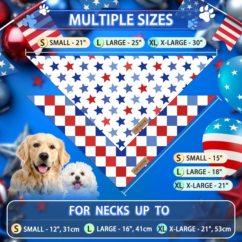 Oritasy Checkered 4th of July Dog Bandanas, 2-Pack Triangle Reversible Pet Scarves, Premium Fabric, US American Flag Bandana for All Dogs (X-Large, Style 25-1)