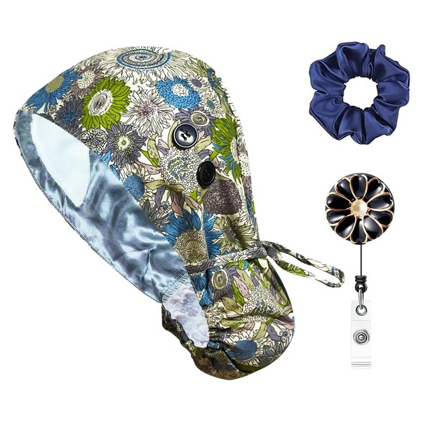 ORKSEA Satin Lined Scrub Caps with Buttons Sweathand Nurse Surgical Bouffant Adjustable Hat Ponytail Working Long Hair