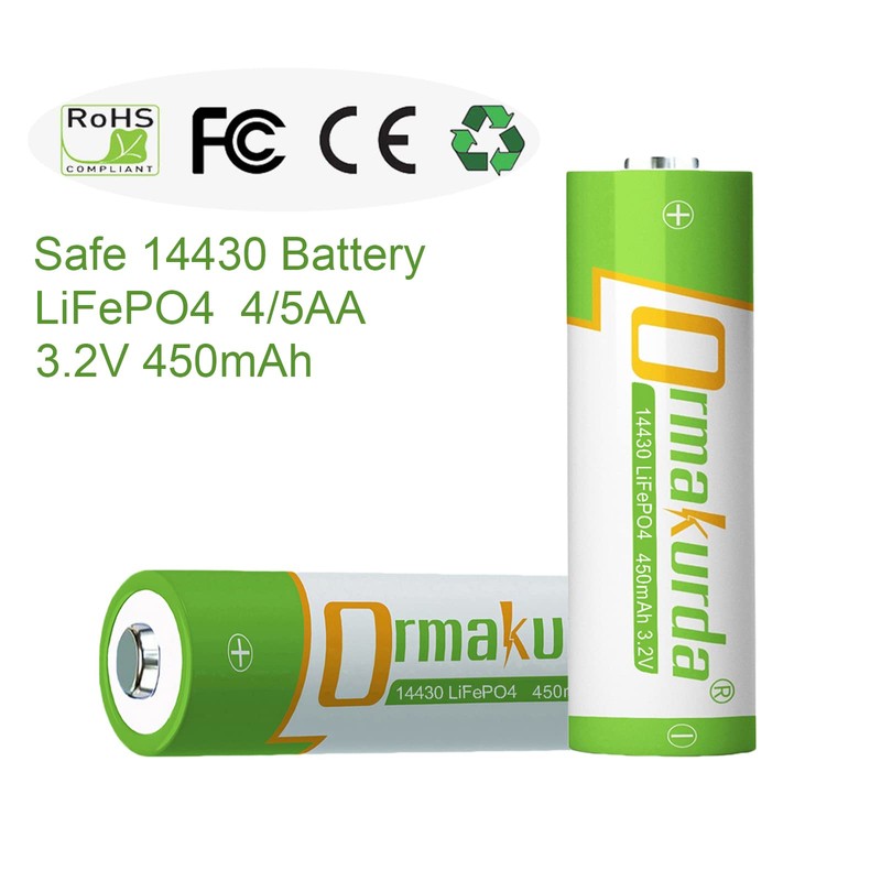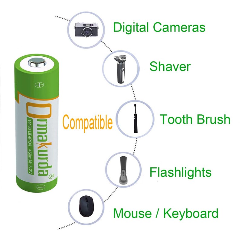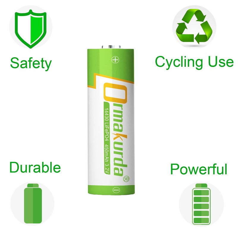 - Wide Compatibility : Ormakurda 14430 LiFePO4 battery Can use for outdoor solar lights, Home Security Systems, Digital Cameras, Tooth Brush, Shaver, Mobile mouse or keyboard.(Make Sure that the device's Battery Size is 14430 LifePO4 3.2v 4/5AA size)