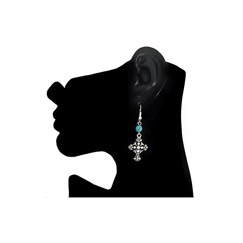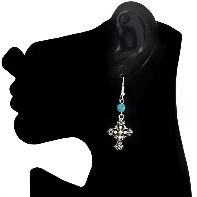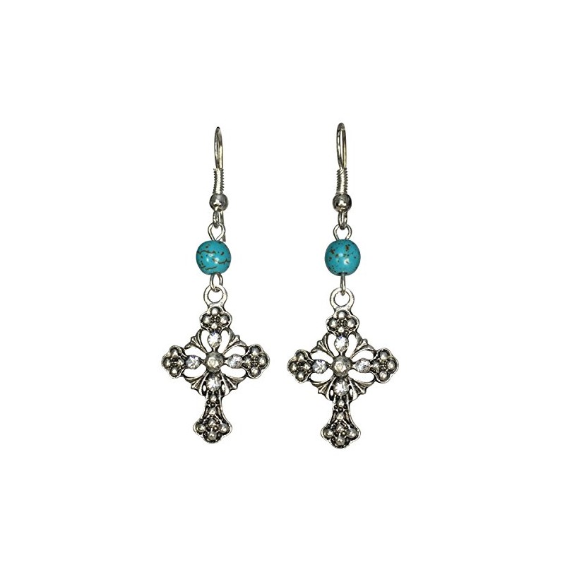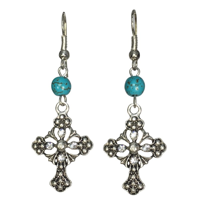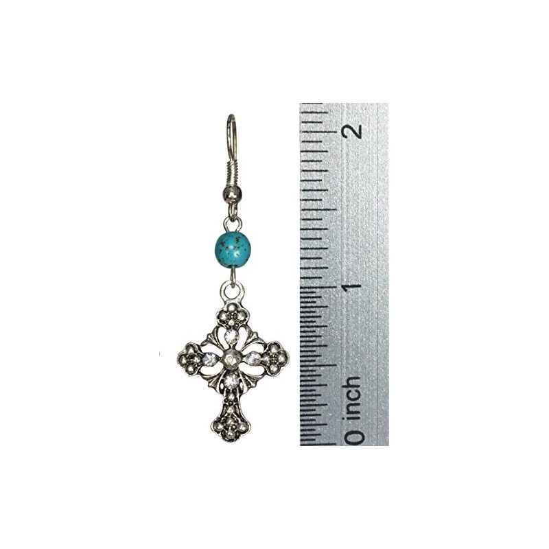 Ornate Christian Cross with Rhinestones & Bead Silver Tone Dangle Earrings (Simulated Turquoise Bead)