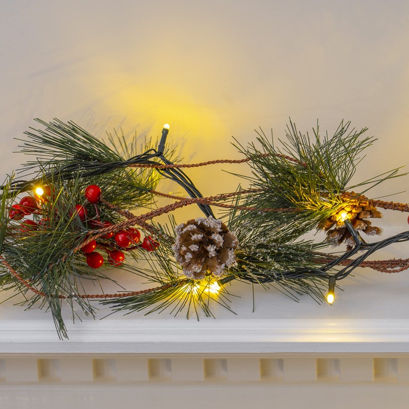 - The garland is 6 feet long and made with wire so the pinecones and berries can be made to stand out.