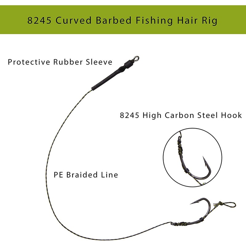 - Hook features: hooks made of carbon steel with Teflon, rust protection. Hair rigs with sharp carp hooks with curved shaft, the sharp hooks usually grip securely into the fish's lip. This makes it difficult for the fish to spit the hook.