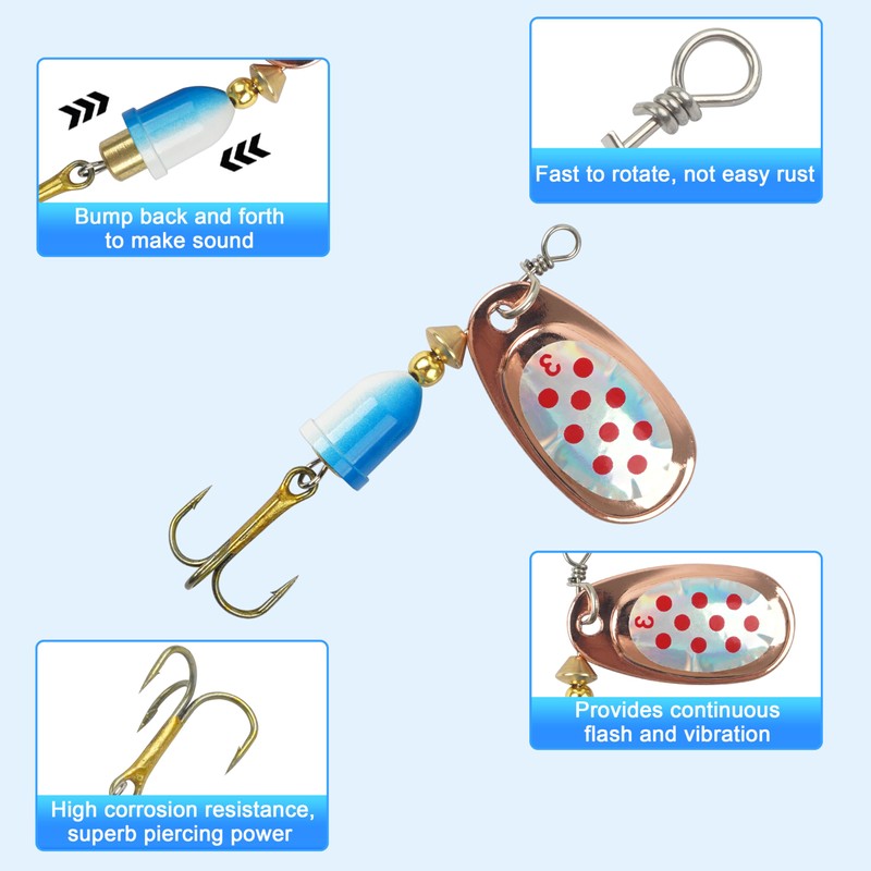 • 【Vigorous Spinning Action】The motion in the water is excellent, and it doesn't take a hard or speedy retrieve to start them spinning. Rotatable bright blades provide a constant flash and vibration to mimic the genuine swimming actions of tiny fish and draw in larger fish