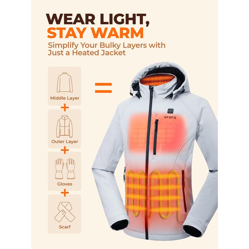ORORO Women's Heated Jacket with Heated Collar, 4 Heat Zones Heated Coat with Battery and Detachable Hood (Sharkskin Grey,XL)
